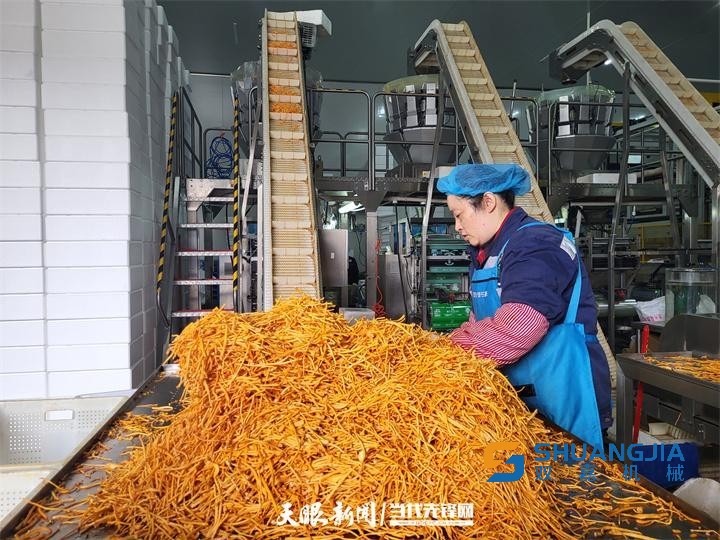走進工廠,只見數(shù)十臺自動化設備有序運轉(zhuǎn),一袋袋包裝精美的蟲草花經(jīng)過裝盆、滅菌、接種、培養(yǎng)、出菇、包裝等工序后發(fā)往川渝、兩廣及海外市場。